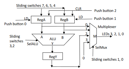 This project involved designing and implementing a 4-bit ALU circuit in SystemVerilog by integrating registers, a multiplexer, and an ALU core to perform arithmetic and logic operations. The design was synthesized and deployed on a Basys 3 FPGA using Vivado to ensure that it executes in real-time with hardware.