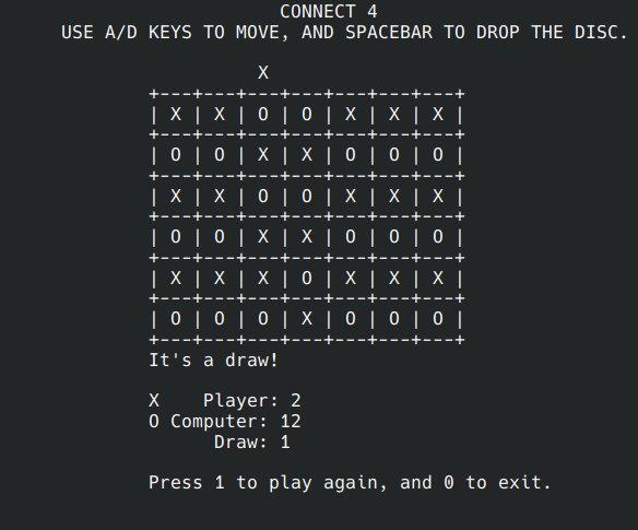 Connect Four is an online game that functions similarly to the identically-named game, Connect 4, programmed in C as the final group project for EE 160. The player was set to be able to play with another player or a computer that randomly places its pieces, named as ‘discs,’ across a 6 x 7 grid. Just like the renowned Connect 4 game, the player must place their discs four in a row either horizontally, vertically, or diagonally. When neither user wins after the final square is filled, it will be considered a draw. The game can keep track of how many games are won by either player or ended in a draw. For additional texture, the player(s) can choose their own piece, be it ‘X’ or ‘C’.